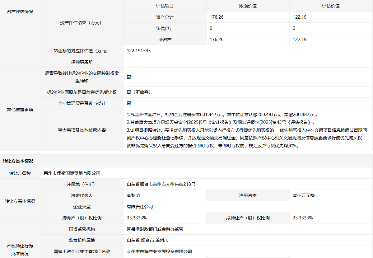 轉(zhuǎn)讓方:萊州市佳衡國(guó)際貿(mào)易有限公司