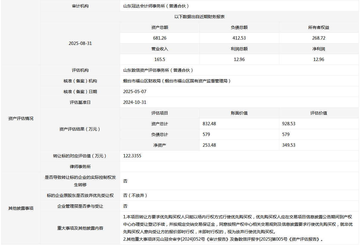 - 轉(zhuǎn)讓方: 煙臺(tái)市福山區(qū)財(cái)政局(煙臺(tái)市福山區(qū)國(guó)有資產(chǎn)監(jiān)督管理局)