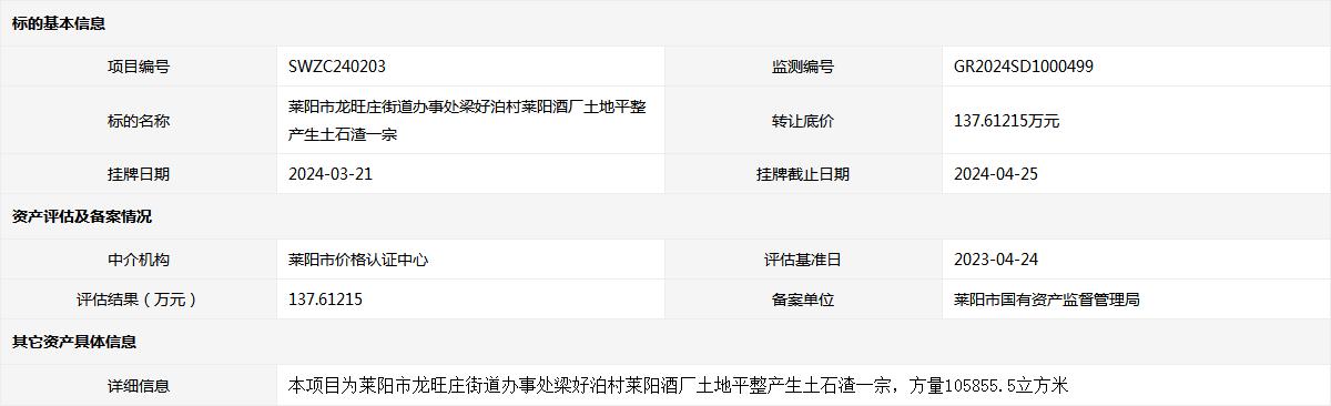 萊陽市龍旺莊街道辦事處梁好泊村萊陽酒廠土地平整產生土石渣一宗