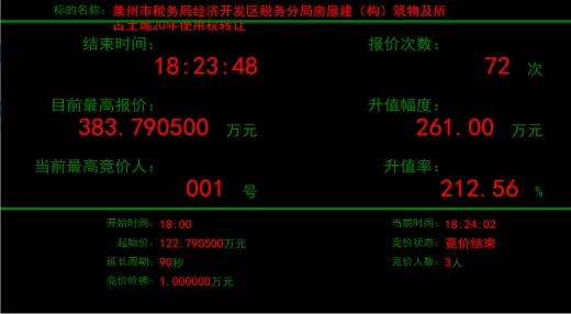 近日,萊州市稅務(wù)局經(jīng)濟(jì)開發(fā)區(qū)稅務(wù)分局所屬房屋建筑物及所占土地20年使用權(quán)轉(zhuǎn)讓項(xiàng)目在煙臺(tái)產(chǎn)權(quán)掛牌并有多個(gè)意向受讓方報(bào)名,最終,經(jīng)過72輪激烈報(bào)價(jià),項(xiàng)目較掛牌底價(jià)122萬元,增值261萬元,增值率高達(dá)212.56%,不但保證了疫情期間國(guó)有產(chǎn)權(quán)業(yè)務(wù)的正常開展,而且?guī)椭a(chǎn)權(quán)持有人實(shí)現(xiàn)了價(jià)值最大化。