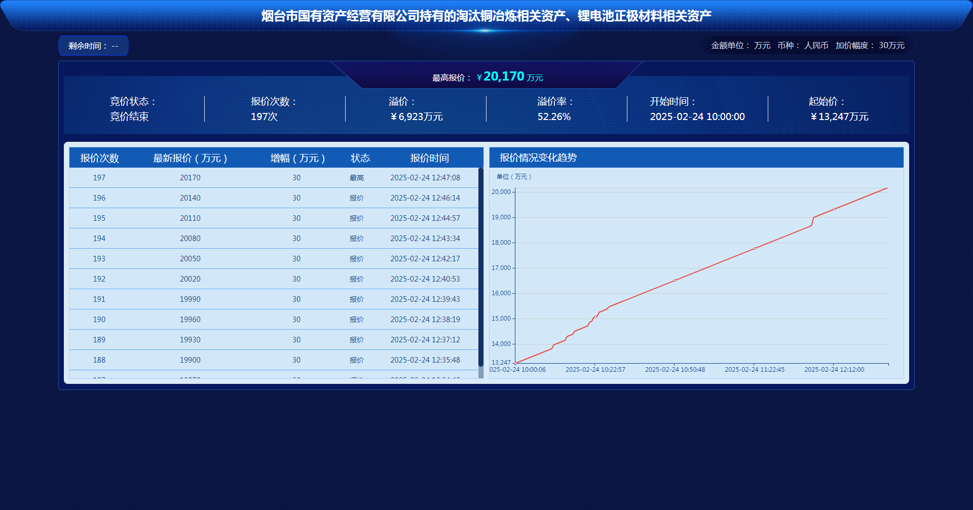 2月24日,“煙臺(tái)市國有資產(chǎn)經(jīng)營(yíng)有限公司持有的淘汰銅冶煉相關(guān)資產(chǎn)、鋰電池正極材料相關(guān)資產(chǎn)項(xiàng)目”在山東產(chǎn)權(quán)交易中心以網(wǎng)絡(luò)競(jìng)價(jià)方式成功出讓。此次交易歷經(jīng)197輪激烈競(jìng)價(jià),持續(xù)近3小時(shí),最終成交金額定格在20170萬元,高于評(píng)估價(jià)8980萬元,較掛牌價(jià)溢價(jià)6923萬元,溢價(jià)率高達(dá)52.26%,成功創(chuàng)下煙臺(tái)聯(lián)合產(chǎn)權(quán)2025年首季資產(chǎn)盤活的“開門紅”。